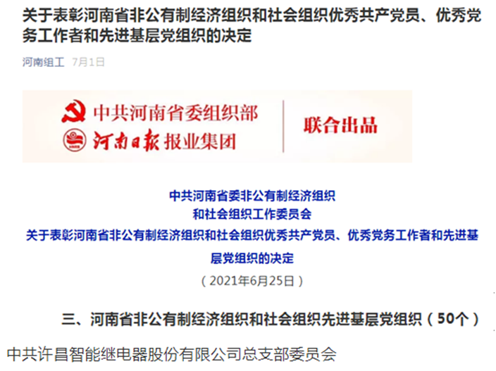 在各省轄市黨委非公有制經(jīng)濟組織和社會組織工作委員會和省級行業(yè)(系統(tǒng))黨委提出推薦對象的基礎(chǔ)上,經(jīng)過認(rèn)真審核遴選、公示,確定了100名優(yōu)秀共產(chǎn)黨員、50名優(yōu)秀黨務(wù)工作者、50個先進基層黨組織表彰對象。中共許昌智能繼電器股份有限公司總支部委員會被表彰為河南省非公有制經(jīng)濟組織和社會組織“先進基層黨組織”。
