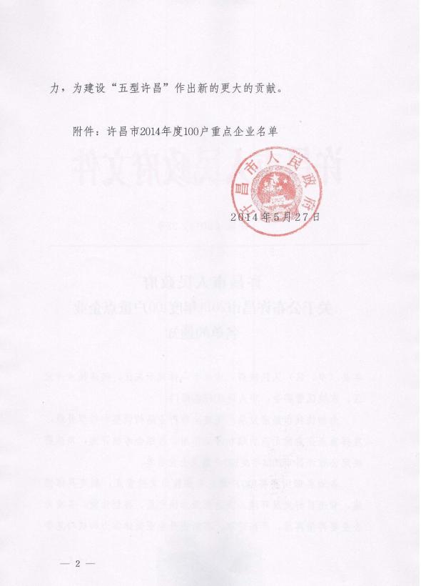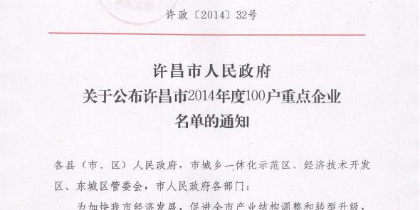 許政[2014]32號(hào)許昌市人民政府關(guān)于公布許昌市2014年度100戶重點(diǎn)企業(yè)名單的通知