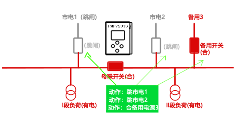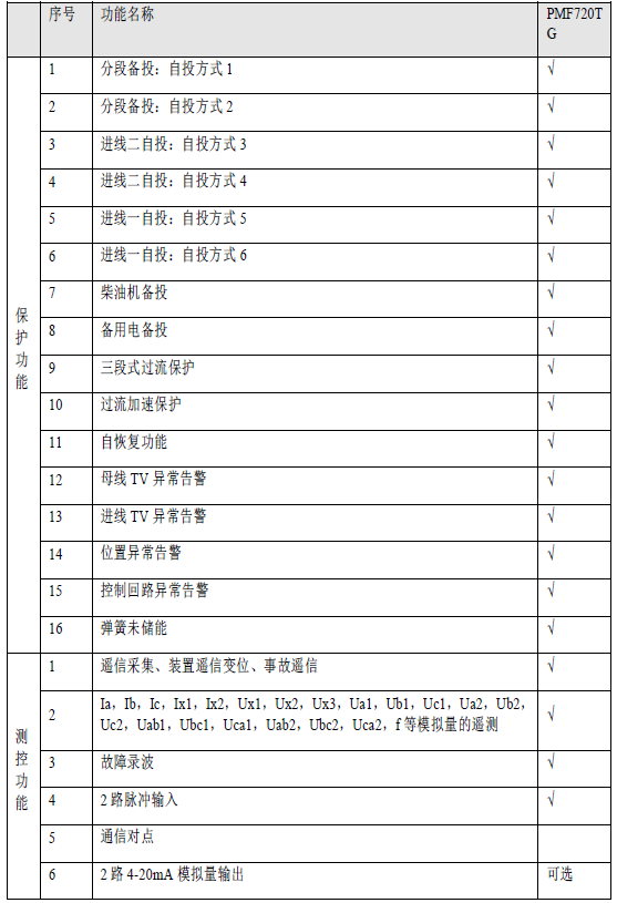 PMF720TG微機備用電源自投裝置可用于分段或單母帶分段運行方式的備用電源投切,可以獨立完成分段自投、分段互投和進線互投、自恢復功能。該裝置通過實時檢測第三路進線電壓,配置了當兩路主電源失電情況下,啟動柴油機自備電或第三路備用電供電,實現(xiàn)三進線備自投的功能,并預留甩負荷出口備用,有過負荷聯(lián)切功能。同時具備三段式電流保護、零序電流保護、過流電流加速等母聯(lián)保護功能,具體功能配置如下: