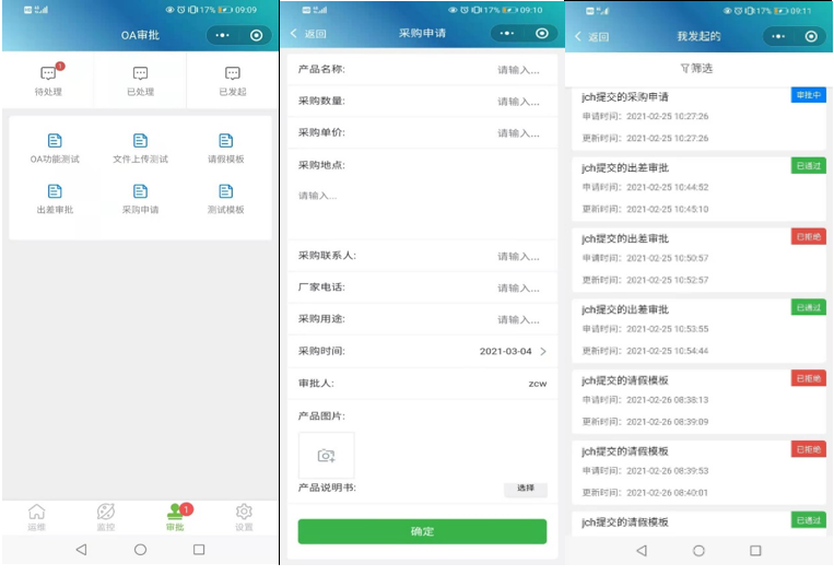 運(yùn)維云平臺(tái)同樣提供對(duì)微信小程序客戶(hù)端的支持,用戶(hù)只需使用微信掃描運(yùn)維云平臺(tái)二維碼,即可實(shí)現(xiàn)對(duì)運(yùn)維云平臺(tái)的訪問(wèn)功能。系統(tǒng)提供對(duì)Android和IOS平臺(tái)的兼容性支持。微信小程序OA在線(xiàn)審批功能界面如下圖所示。