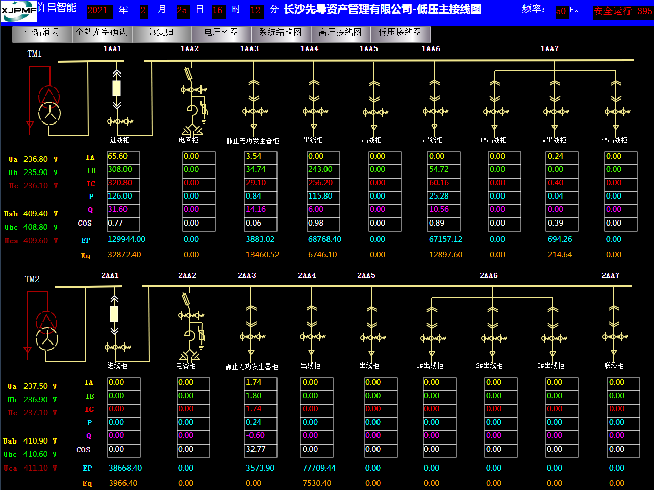 系統(tǒng)通過(guò)組態(tài)工具將主接線(xiàn)圖與裝置進(jìn)行關(guān)聯(lián)配置,通過(guò)實(shí)時(shí)監(jiān)控界面可以實(shí)時(shí)監(jiān)測(cè)配電室的各個(gè)設(shè)備運(yùn)行情況,包括整個(gè)系統(tǒng)的通訊結(jié)構(gòu)狀態(tài),各間隔的開(kāi)關(guān)量狀態(tài)、電壓、電流、功率等實(shí)時(shí)遙測(cè)數(shù)據(jù)。值班室可以根據(jù)實(shí)際需要遙控?cái)嗦菲鞯拈_(kāi)合閘等操作。