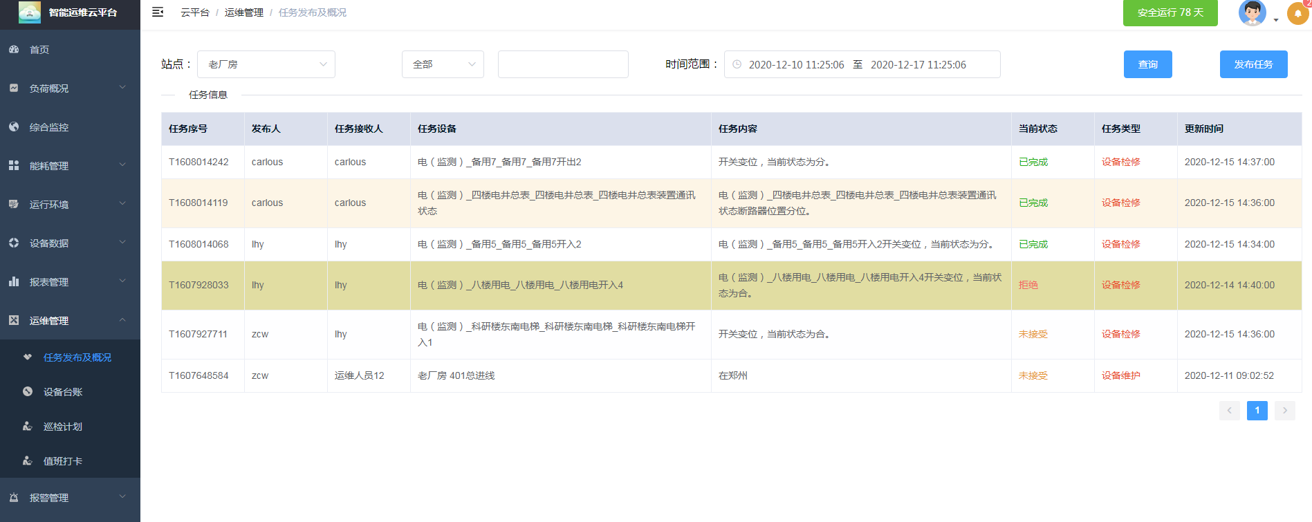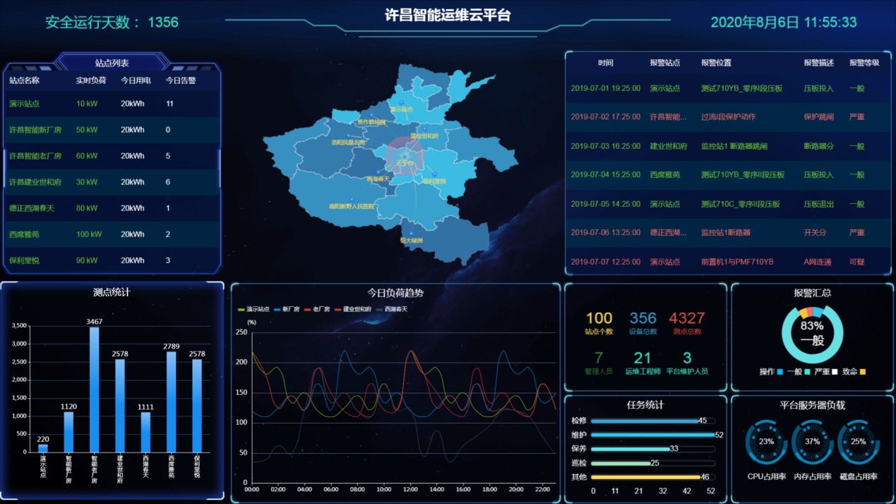 大屏展示可以集中顯示一定區(qū)域內(nèi)各個站點設(shè)備負荷及運行狀況,用電負荷、報警信息及任務(wù)發(fā)布匯總等,通過大屏可以整體了解平臺運行情況。