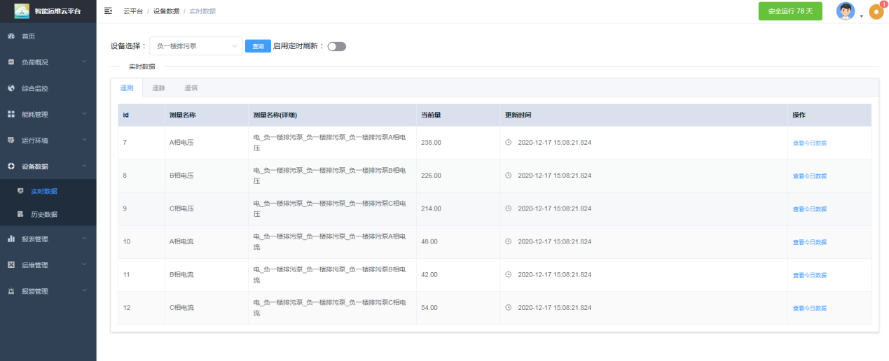 可以實時監(jiān)測變電所單個設(shè)備的實時測量數(shù)據(jù),如三相電壓、三相電流、有功電量、無功電量、遙信狀態(tài)等,并顯示設(shè)備歷史測量數(shù)據(jù)的曲線報表。