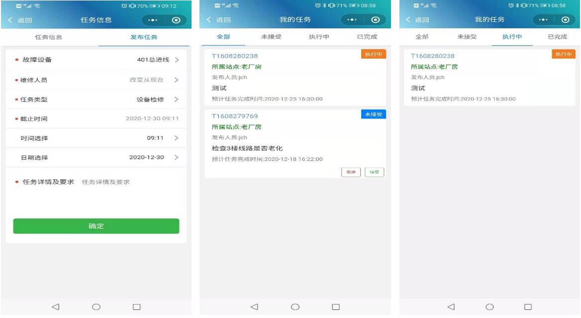 管理員可以在監(jiān)控中心或手機上給某個指定運維人員發(fā)布運維任務(wù),運維人員在手機App上點擊我的任務(wù)一欄,查看自己被分配的任務(wù),然后根據(jù)實際情況執(zhí)行任務(wù)并記錄任務(wù)結(jié)果。
