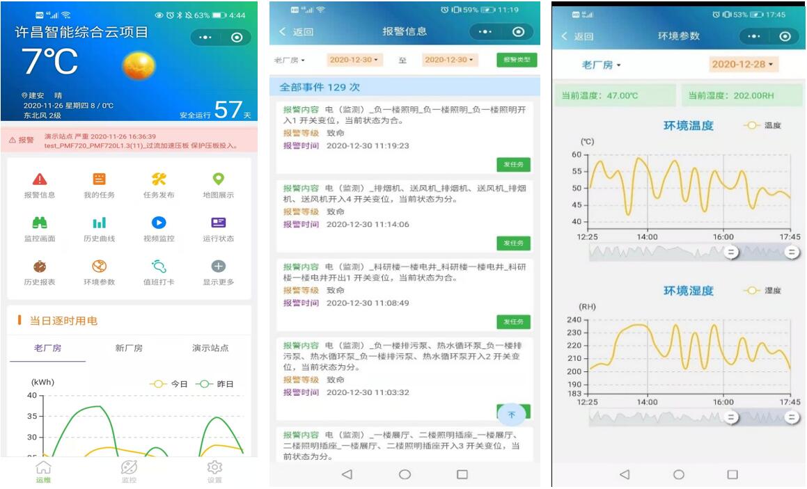 手機App及小程序首頁功能結(jié)構(gòu)、報警推送及查詢、環(huán)境監(jiān)測等功能效果截圖如下。