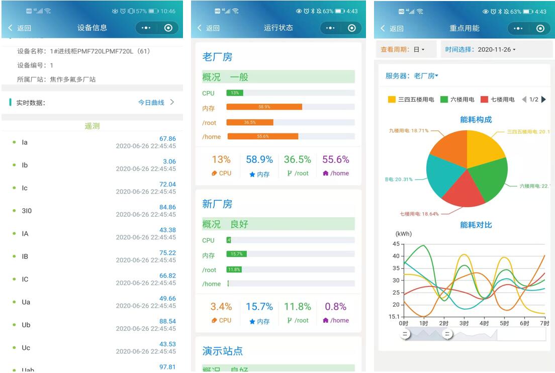 手機app及小程序電力設(shè)備在線監(jiān)測、服務(wù)器運行狀態(tài)監(jiān)視及重點能用分析等功能效果截圖如下。