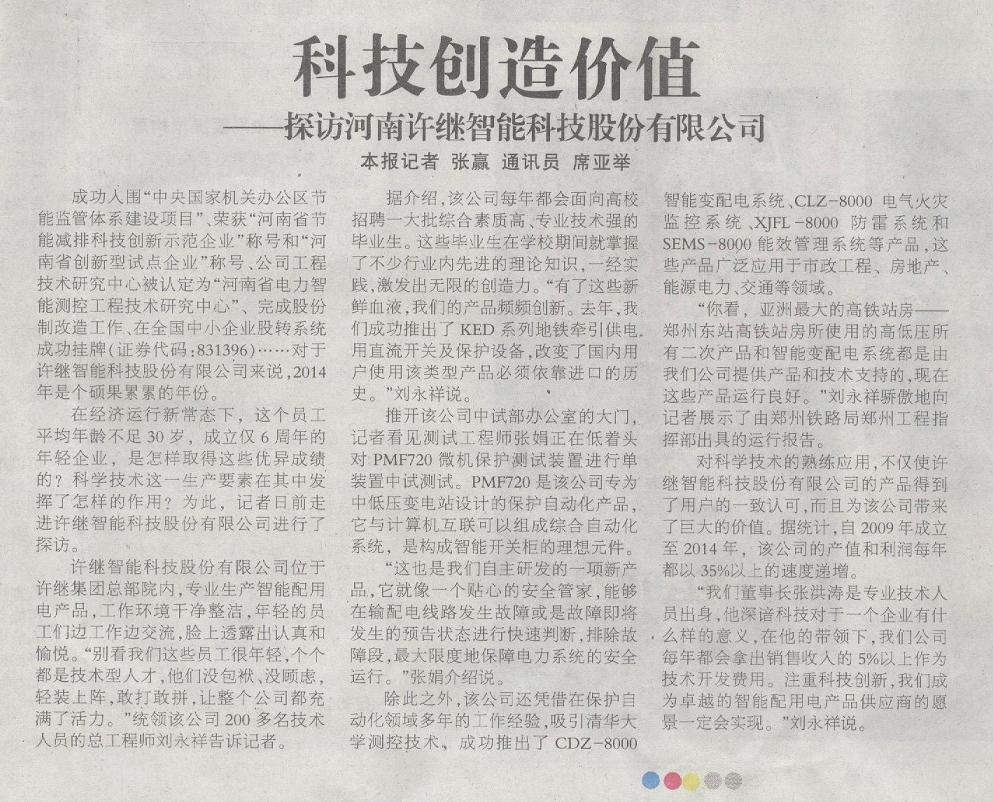 成功入圍“中央國家機關(guān)辦公區(qū)節(jié)能監(jiān)管體系建設(shè)項目”、榮獲“河南省節(jié)能減排科技創(chuàng)新示范企業(yè)”稱號和“河南省創(chuàng)新型試點企業(yè)”稱號、公司工程技術(shù)研究中心被認定為“河南省電力智能測控工程技術(shù)研究中心”、完成股份制改造工作、在全國中小企業(yè)股轉(zhuǎn)系統(tǒng)成功掛牌(證券代碼:831396)……對于許繼智能科技股份有限公司來說,2014年是個碩果累累的年份。