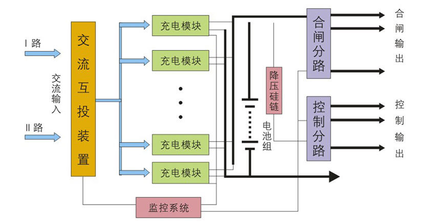 (2)當(dāng)控制負(fù)荷或動力負(fù)荷需較大的沖擊電流(如斷路器的分、合閘)時(shí),由充電單元和蓄電池共同提供直流電源;