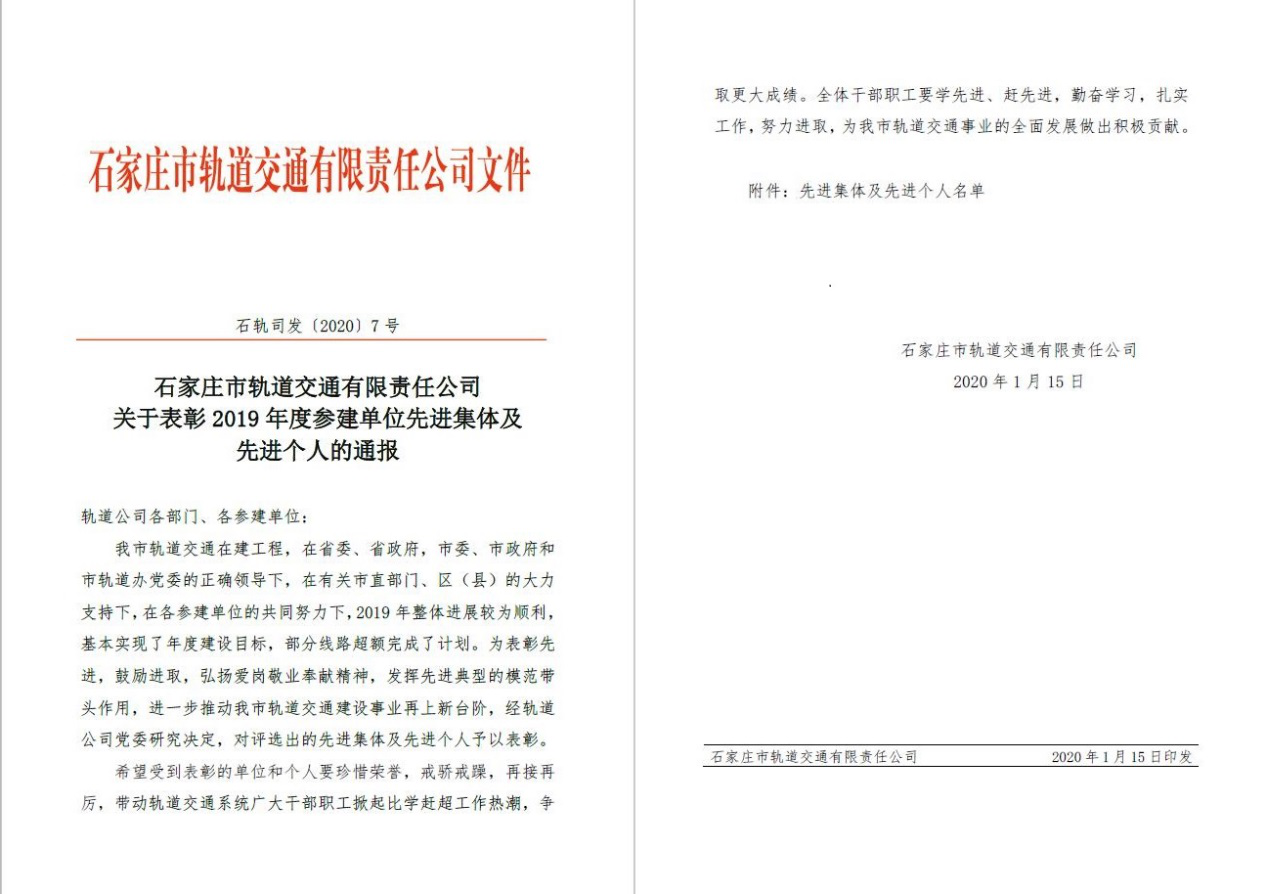 日前,石家莊市軌道交通有限責(zé)任公司公布了《關(guān)于表彰2019年度參建單位先進(jìn)集體及先進(jìn)個(gè)人的通報(bào)》,對(duì)2019年度推動(dòng)石家莊市軌道交通建設(shè)事業(yè)再上新臺(tái)階的集體和個(gè)人給予表彰。許昌智能繼電器股份有限公司作為石家莊地鐵1號(hào)線二期環(huán)控電控柜和群控柜的設(shè)備供應(yīng)商,以其優(yōu)秀的產(chǎn)品、優(yōu)質(zhì)的服務(wù)獲得了用戶的認(rèn)可,從上百家供貨單位中脫穎而出,榮獲優(yōu)秀設(shè)備供貨服務(wù)單位。同時(shí),我公司員工武學(xué)理、郭永凱以其專業(yè)的技術(shù)、優(yōu)質(zhì)的服務(wù)榮獲常規(guī)設(shè)備供貨服務(wù)先進(jìn)個(gè)人稱號(hào)。