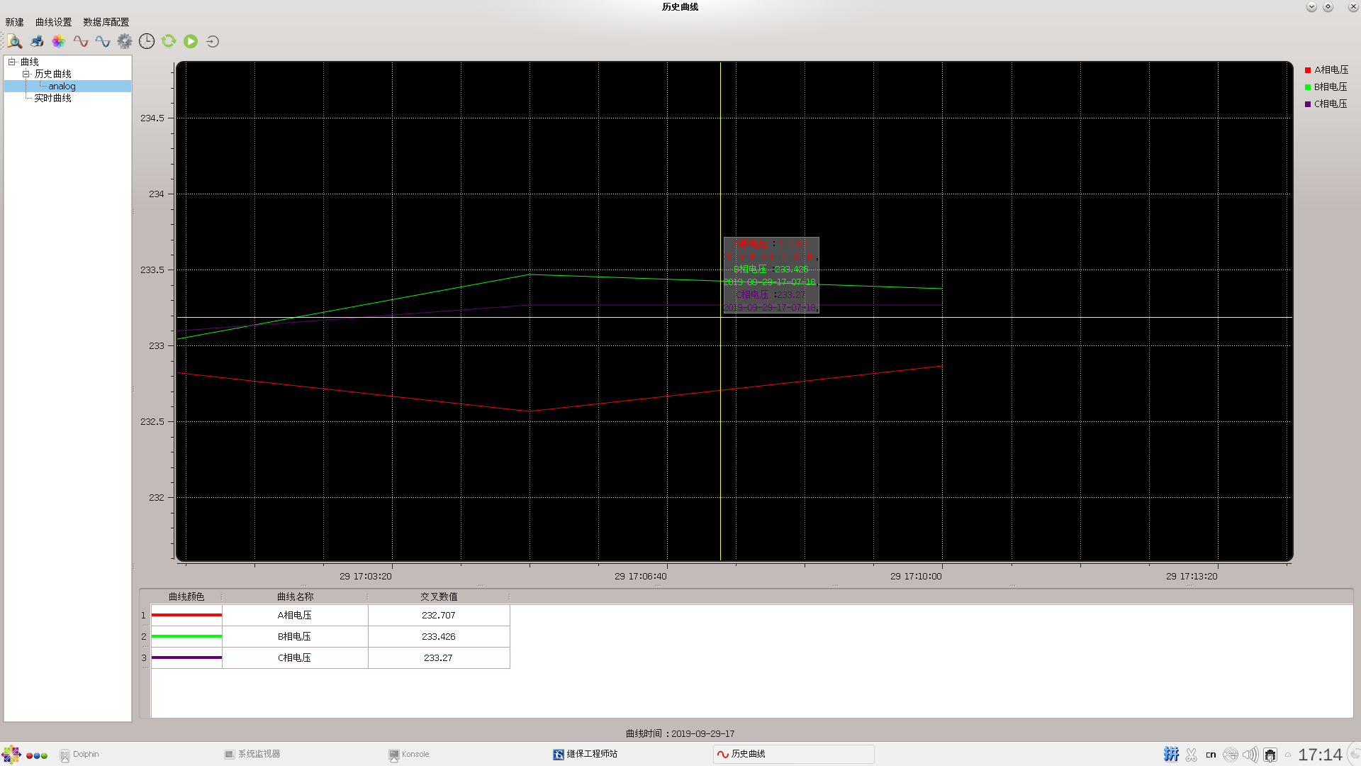 電力監(jiān)控系統(tǒng)可通過采集電壓參量來繪制電壓曲線的時間跨度可設(單位為:天),初始進入該界面時曲線圖形應為實時曲線。當設定好曲線的起始時間,點擊界面中的刷新曲線按鈕時,此時曲線應自動切換為歷史曲線,顯示的為自曲線的起始時間至設置時間后的趨勢曲線。通過對曲線的分析可了解該配電電壓是否穩(wěn)定,是否達到電壓上下浮動要求。