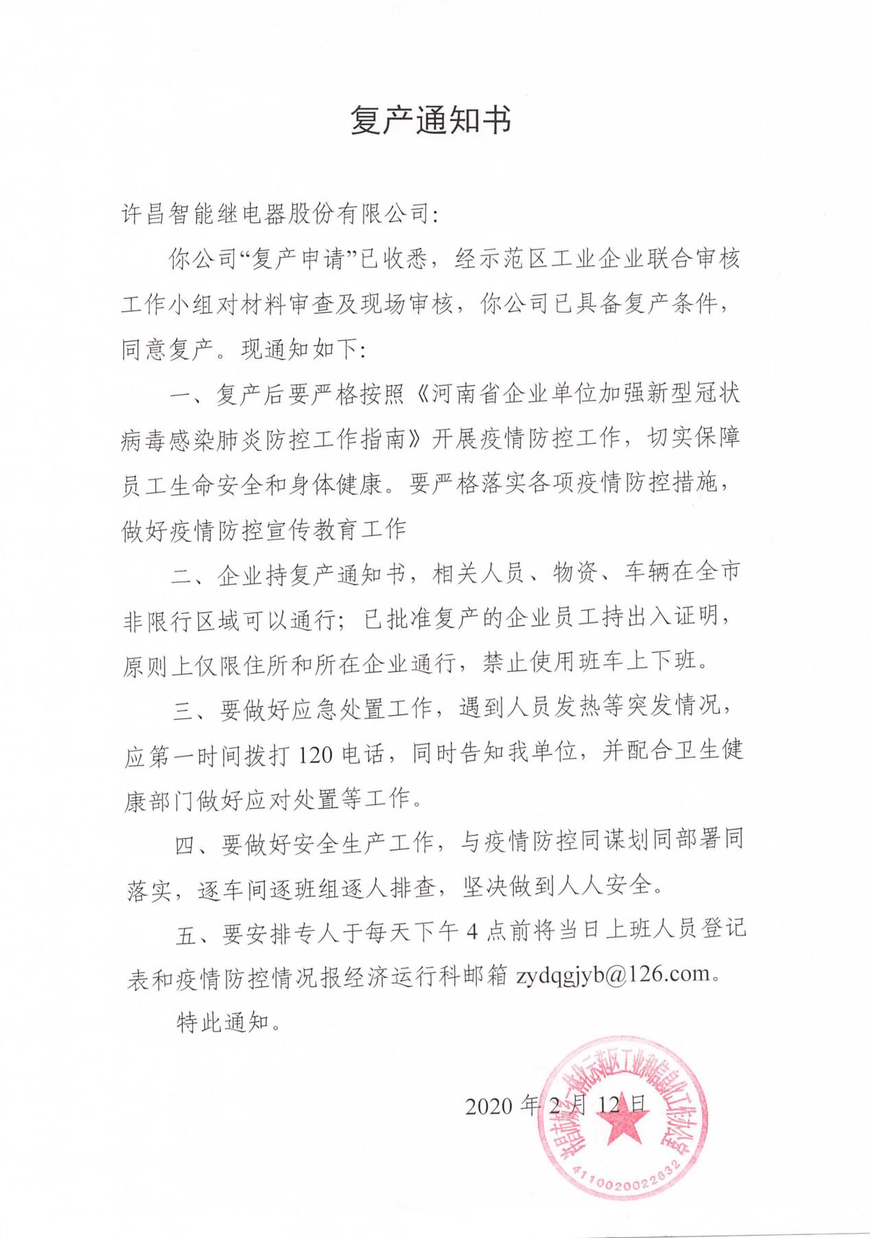 2月11日,許昌智能應(yīng)征援建由鄭州市委、市政府指派的鄭州市第一人民醫(yī)院傳染病醫(yī)院工程(鄭州市新型冠狀病毒感染的肺炎疫情定點(diǎn)救治醫(yī)院)。鄭州“小湯山”工程時(shí)間緊、任務(wù)重,為更好完成“戰(zhàn)疫”,許昌智能防控小組以“早動(dòng)手、細(xì)規(guī)范、上裝備、定措施”為原則,以企業(yè)安全復(fù)工為目標(biāo),嚴(yán)格按照示范區(qū)企業(yè)復(fù)產(chǎn)審批的各項(xiàng)要求提交復(fù)工申請(qǐng)并做好防疫準(zhǔn)備。經(jīng)許昌市城鄉(xiāng)一體化示范區(qū)工業(yè)企業(yè)聯(lián)合審核工作小組對(duì)公司復(fù)工申請(qǐng)材料的審查及現(xiàn)場(chǎng)審核,于2月12日向公司發(fā)放正式復(fù)產(chǎn)通知書(shū)。