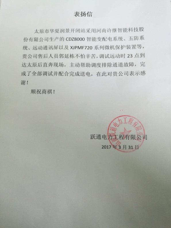 在該項(xiàng)目開(kāi)閉所調(diào)試期間,我公司售后人員響應(yīng)迅速、服務(wù)熱情,站內(nèi)調(diào)試時(shí)耐心指導(dǎo)施工方排除接線故障并認(rèn)真對(duì)用戶(hù)進(jìn)行了培訓(xùn),并主動(dòng)幫助調(diào)度排除通道故障。送電圓滿(mǎn)結(jié)束后,用戶(hù)表示對(duì)我公司設(shè)備和售后服務(wù)非常滿(mǎn)意,開(kāi)具了運(yùn)行報(bào)告和表?yè)P(yáng)信。(文末附運(yùn)行報(bào)告、表?yè)P(yáng)信)