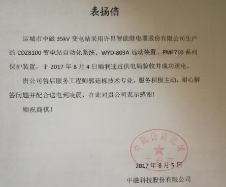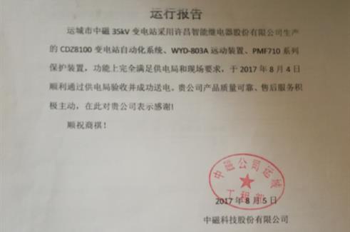 中磁35kV變電站位于運(yùn)城市萬(wàn)榮恒磁工業(yè)園中磁科技股份有限公司廠區(qū)內(nèi),于2017年8月4日順利通過(guò)供電局送電驗(yàn)收。中磁科技結(jié)束了一直使用臨時(shí)電的尷尬局面,從而用上了安全、可靠、穩(wěn)定的放心電,為公司的快速發(fā)展提供了強(qiáng)有力的保障。