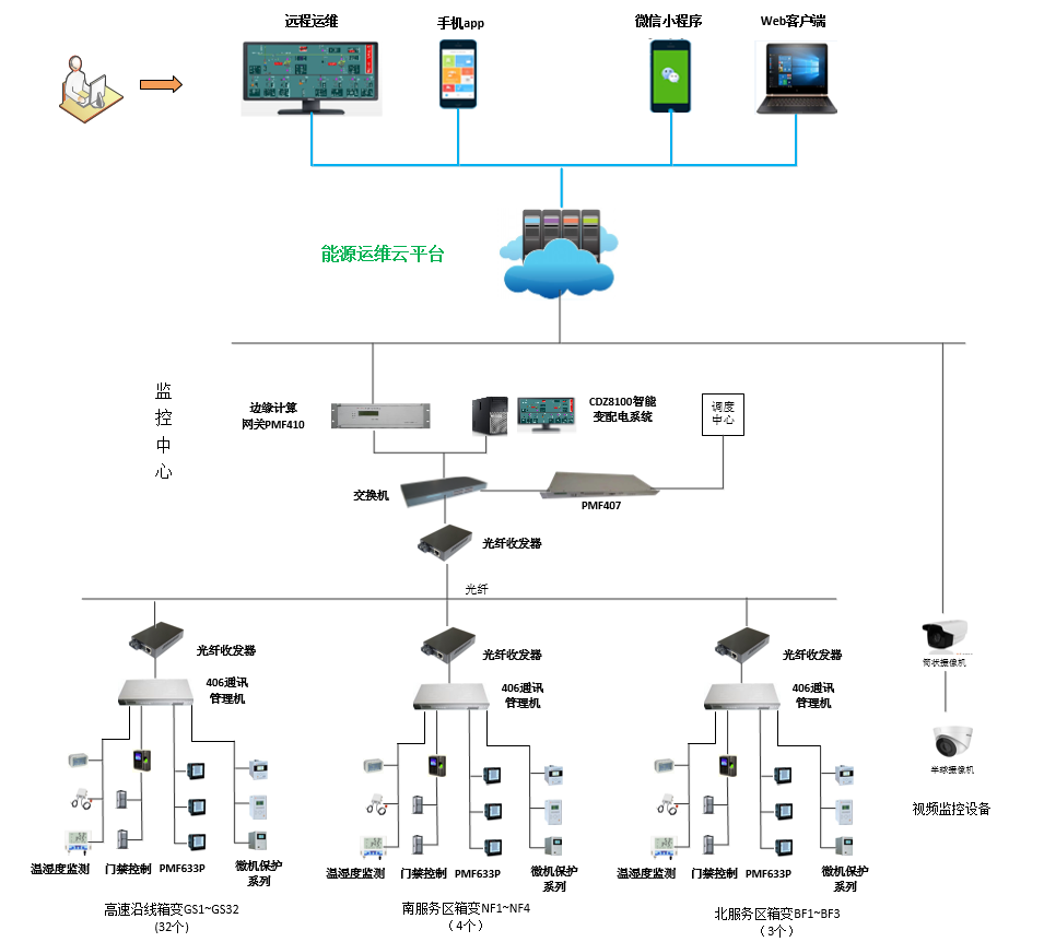 根據(jù)上述新機(jī)場高速沿線箱變站的現(xiàn)狀分析及目前存在的問題,建議使用許昌智能ECLOUD-8000運(yùn)維云平臺整體解決方案,采用監(jiān)控中CDZ8100監(jiān)控+ ECLOUD-8000運(yùn)維云平臺部署的方式,既能實現(xiàn)在監(jiān)控中心的集中監(jiān)控與實時監(jiān)測,又能實現(xiàn)手機(jī)App、微信小程序等客戶端隨時隨地遠(yuǎn)程訪問及監(jiān)控,同時利用移動互聯(lián)網(wǎng)等方式實現(xiàn)沿線箱變站的日常運(yùn)維管理的流程化及信息化。
