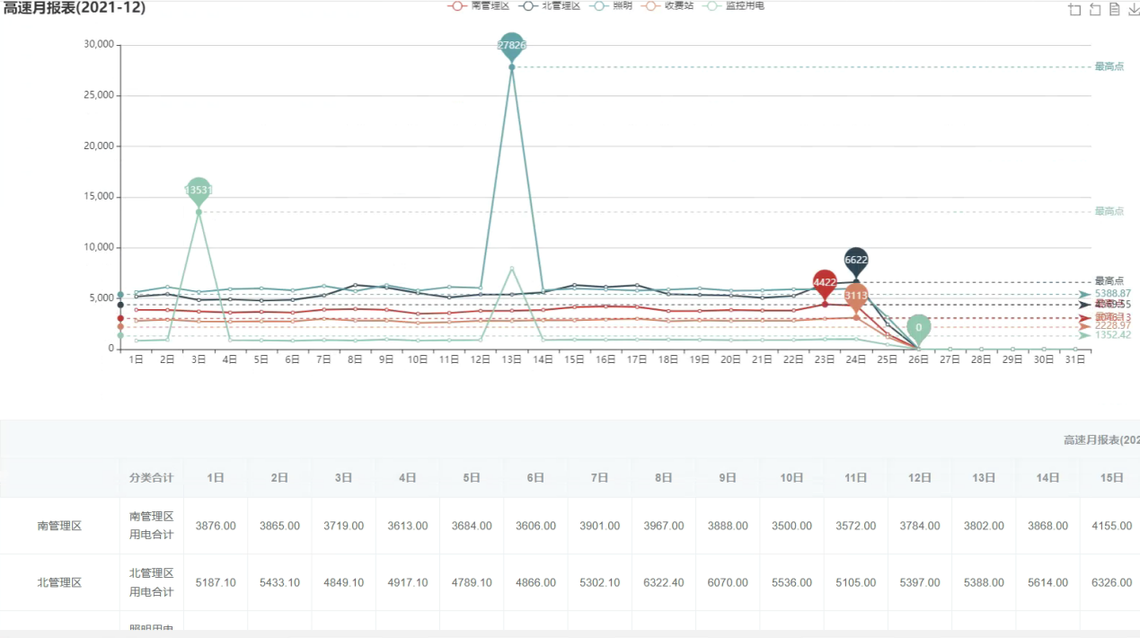 高速沿線39個箱變,根據(jù)箱變內(nèi)設(shè)備用電類型不同制作定制化報表,支持用戶按照不同的用電類別,分類統(tǒng)計匯總展示用電年、月、日表底值、增量值報表數(shù)據(jù)展示并導(dǎo)出Excel表格。