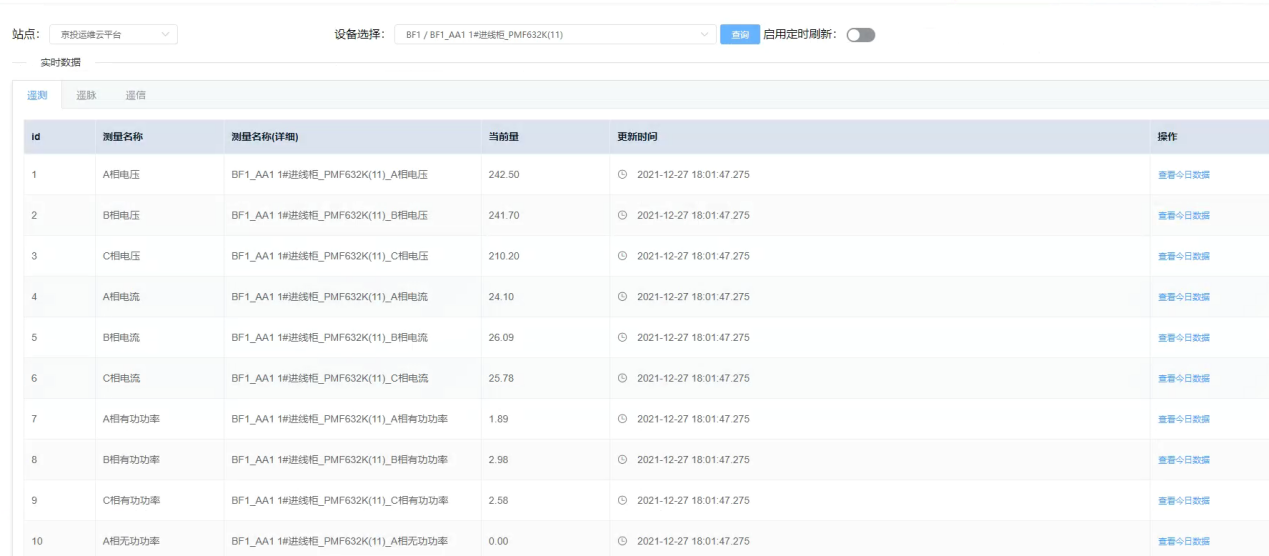 ECloud-8000能源運(yùn)維云平臺可以支持對當(dāng)前系統(tǒng)中所有設(shè)備實時數(shù)據(jù)的遠(yuǎn)程訪問功能,用戶可通過列表查看設(shè)備下所有測點的實時數(shù)據(jù)狀態(tài),并能查看當(dāng)前數(shù)據(jù)點的今日曲線。下圖分別為Web端實時數(shù)據(jù)展示、手機(jī)端實時數(shù)據(jù)及今日曲線展示。