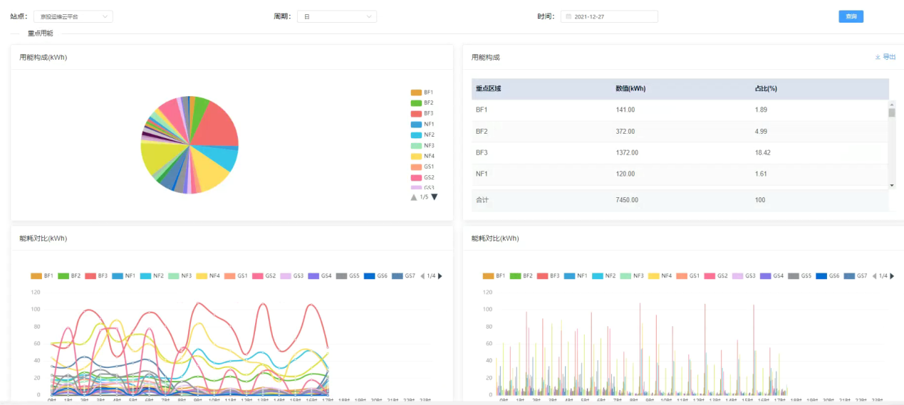 高速沿線39個箱變,根據(jù)箱變內(nèi)設(shè)備用電類型不同制作定制化曲線,支持用戶按照不同的用電類別分類統(tǒng)計匯總展示用電年、月、日曲線數(shù)據(jù)。