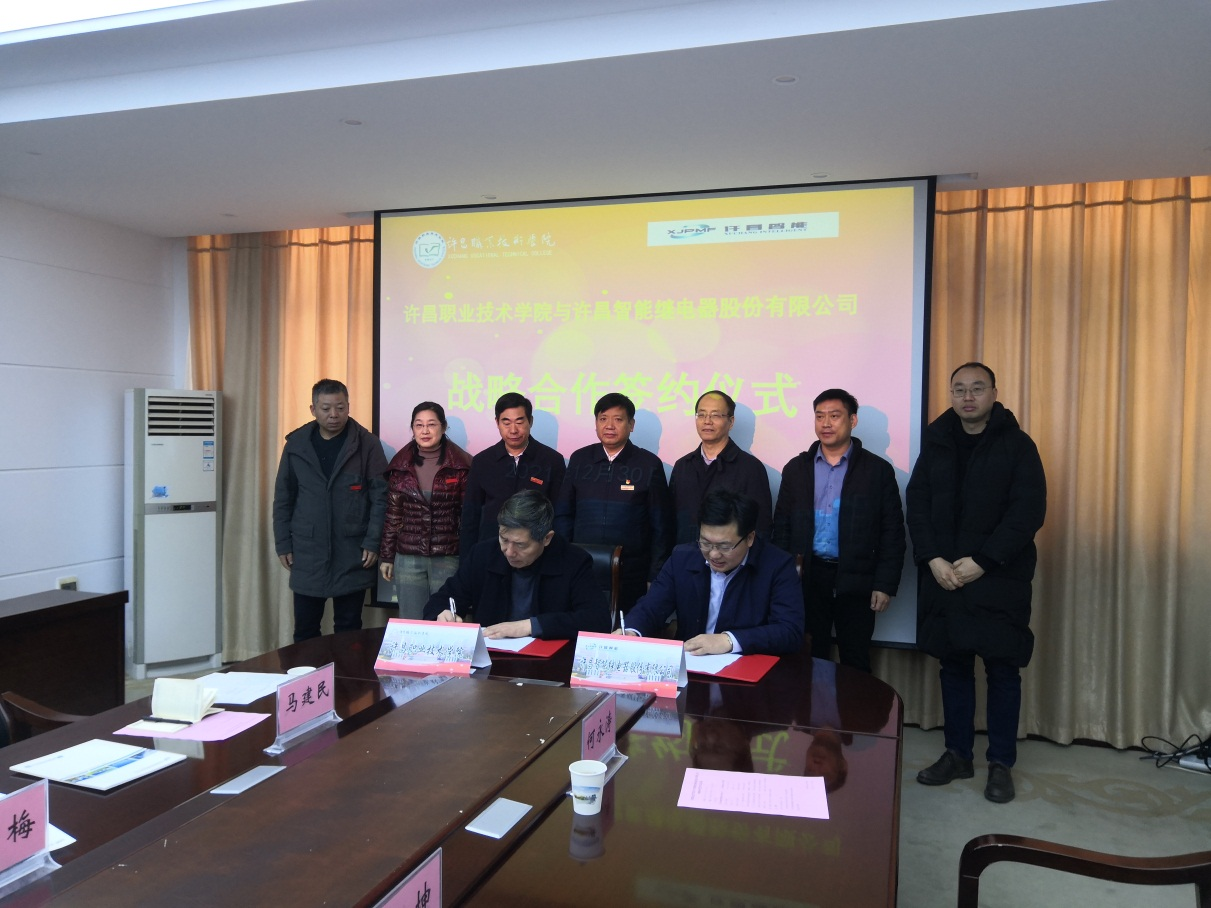 12月30日上午,許昌智能繼電器股份有限公司與許昌職業(yè)技術學院舉辦戰(zhàn)略合作簽約儀式,雙方圍繞電氣工程領域人才培養(yǎng)共建產(chǎn)業(yè)學院,公司董事長張洪濤、書記范會君、許昌職業(yè)技術學院黨委書記尹二軍、校長譚水木等領導出席儀式。