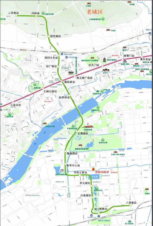 洛陽地鐵2號線一期工程,總長18.216公里,全部為地下線路,全線共設(shè)15個(gè)車站,北起邙山腳下的二喬路站,南至洛河南岸八里堂站,與地鐵1號線在解放路站交會(huì),構(gòu)成一個(gè)橫貫洛陽主城區(qū)東西南北的巨大十字坐標(biāo)軸。