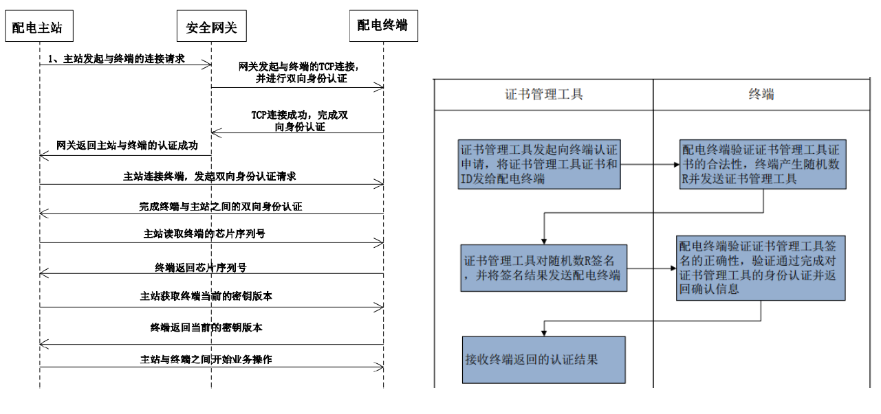 裝置硬加密通訊還需要遵循國網(wǎng)配電終端安全防護(hù)實(shí)施方案的要求,主要包括主站、網(wǎng)關(guān)、運(yùn)維工具三方的通訊,業(yè)務(wù)流程如下: