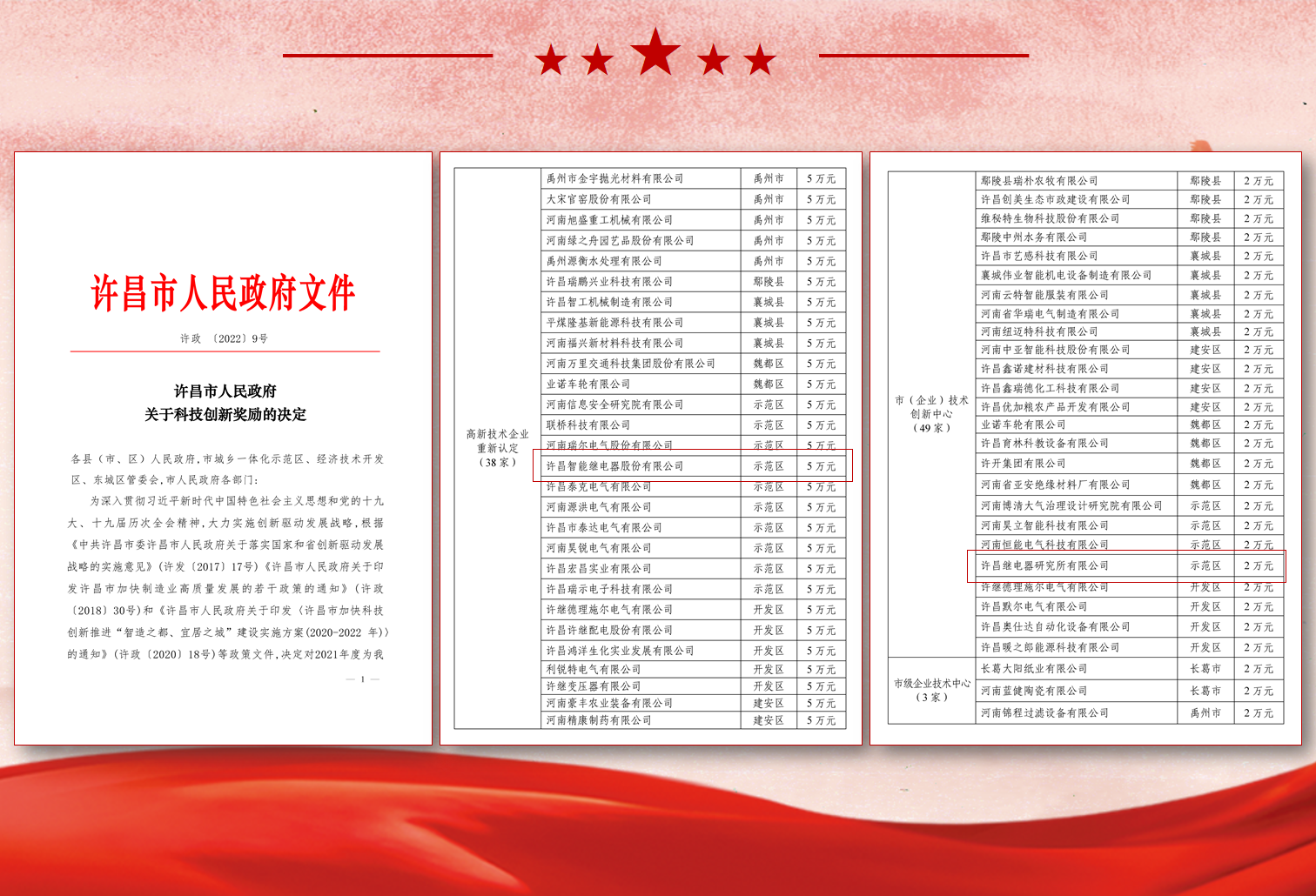 公司始終堅持以提高科技創(chuàng)新能力為目標,不斷提升企業(yè)核心競爭力,取得了一系列的可喜成果。2021年,公司被國家工信部認定為國家專精特新“小巨人”企業(yè),連續(xù)四次通過了國家高新技術(shù)企業(yè)認定,子公司許昌繼電器研究所有限公司的研發(fā)平臺被認定為許昌市企業(yè)技術(shù)創(chuàng)新中心。這些榮譽獲得了許昌市政府制造業(yè)高質(zhì)量發(fā)展獎勵和科技創(chuàng)新獎勵。